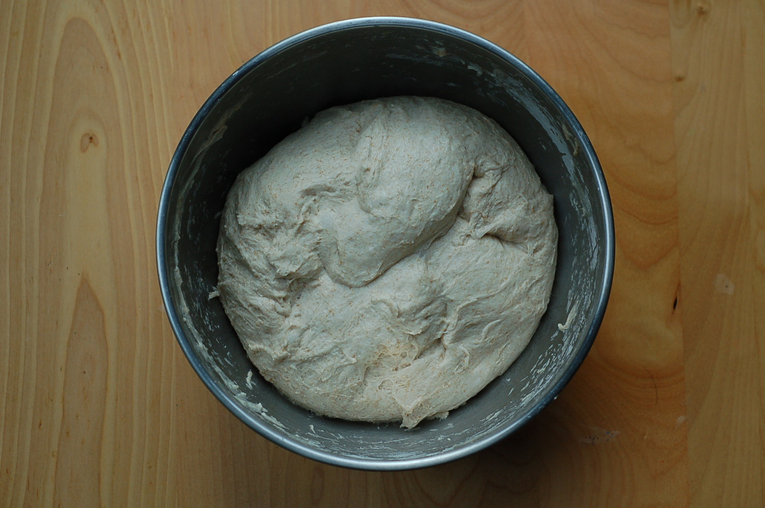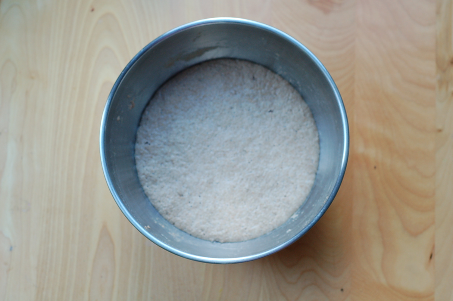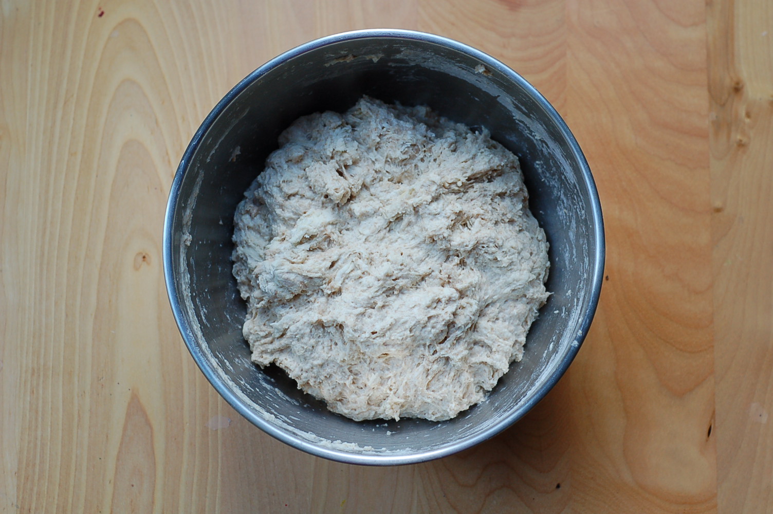 Combine the above ingredients right in with your pre-ferment. I use my hand at this stage to mix it all together. It will look a bit lumpy and raggedy, but don’t fret. The magic will happen over the next two and a half hours. Cover the mixing bowl and set aside.