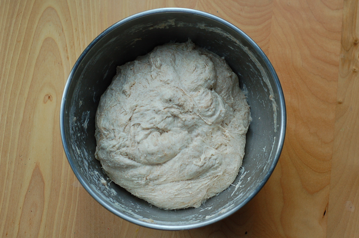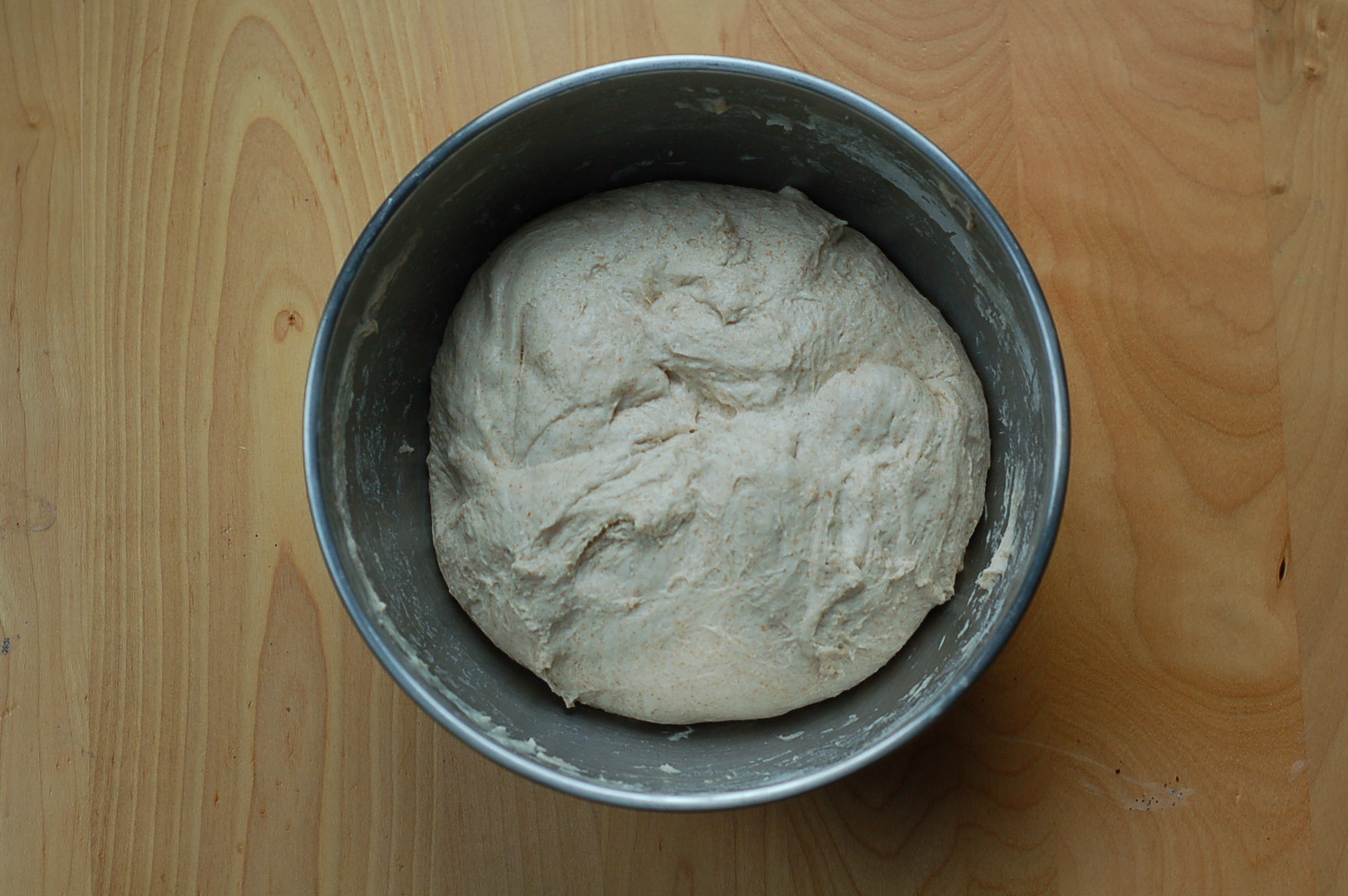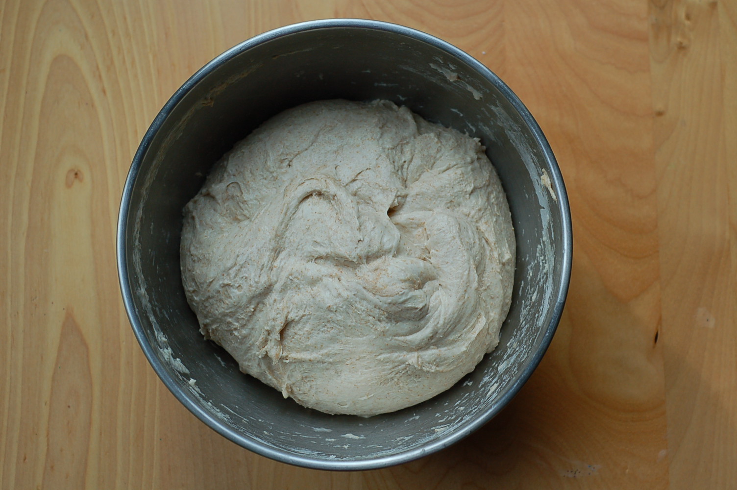 Combine the above ingredients right in with your pre-ferment. I use my hand at this stage to mix it all together. It will look a bit lumpy and raggedy, but don’t fret. The magic will happen over the next two and a half hours. Cover the mixing bowl and set aside.